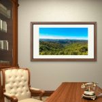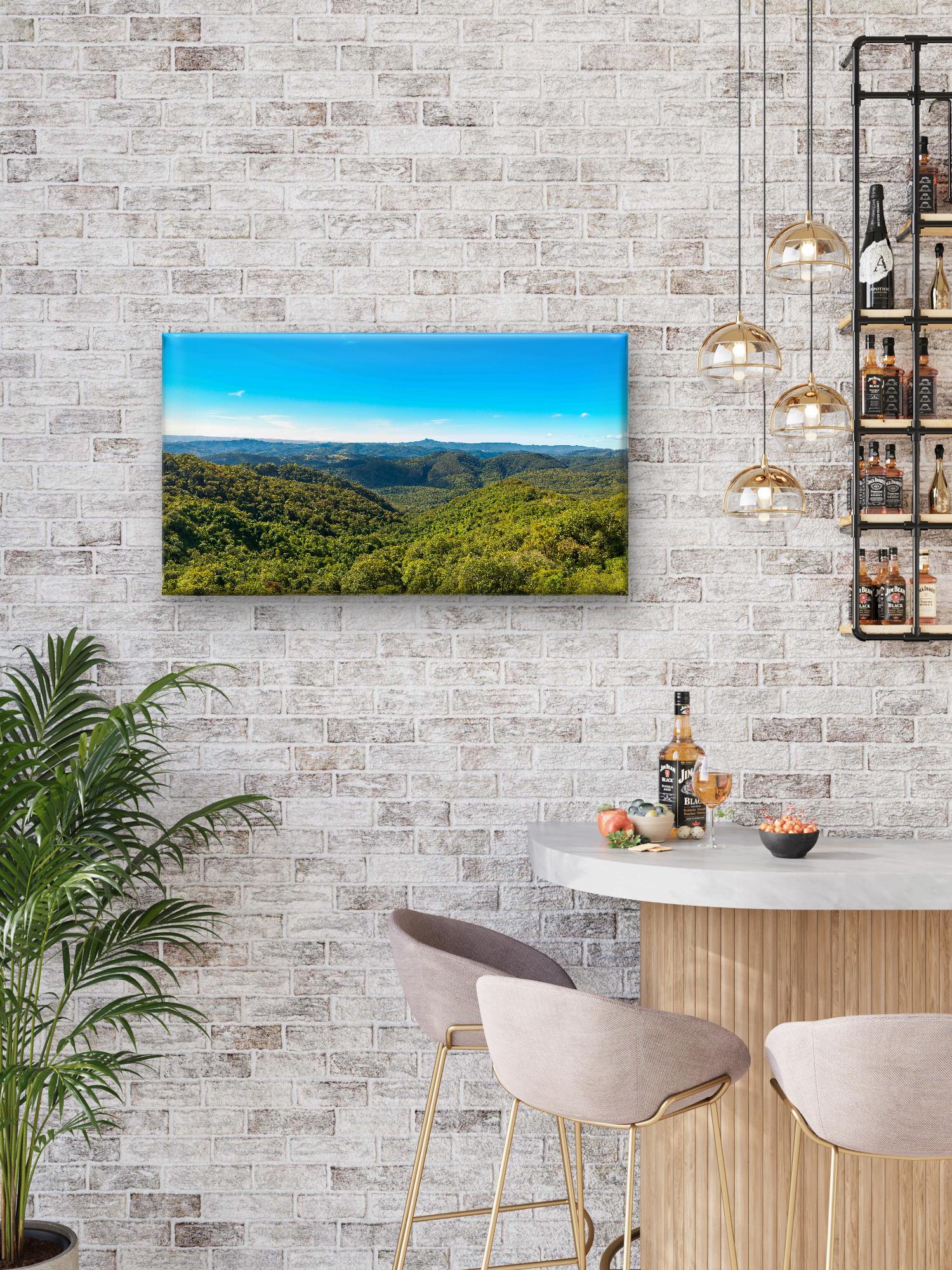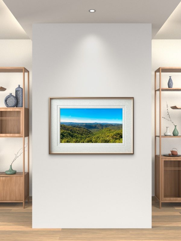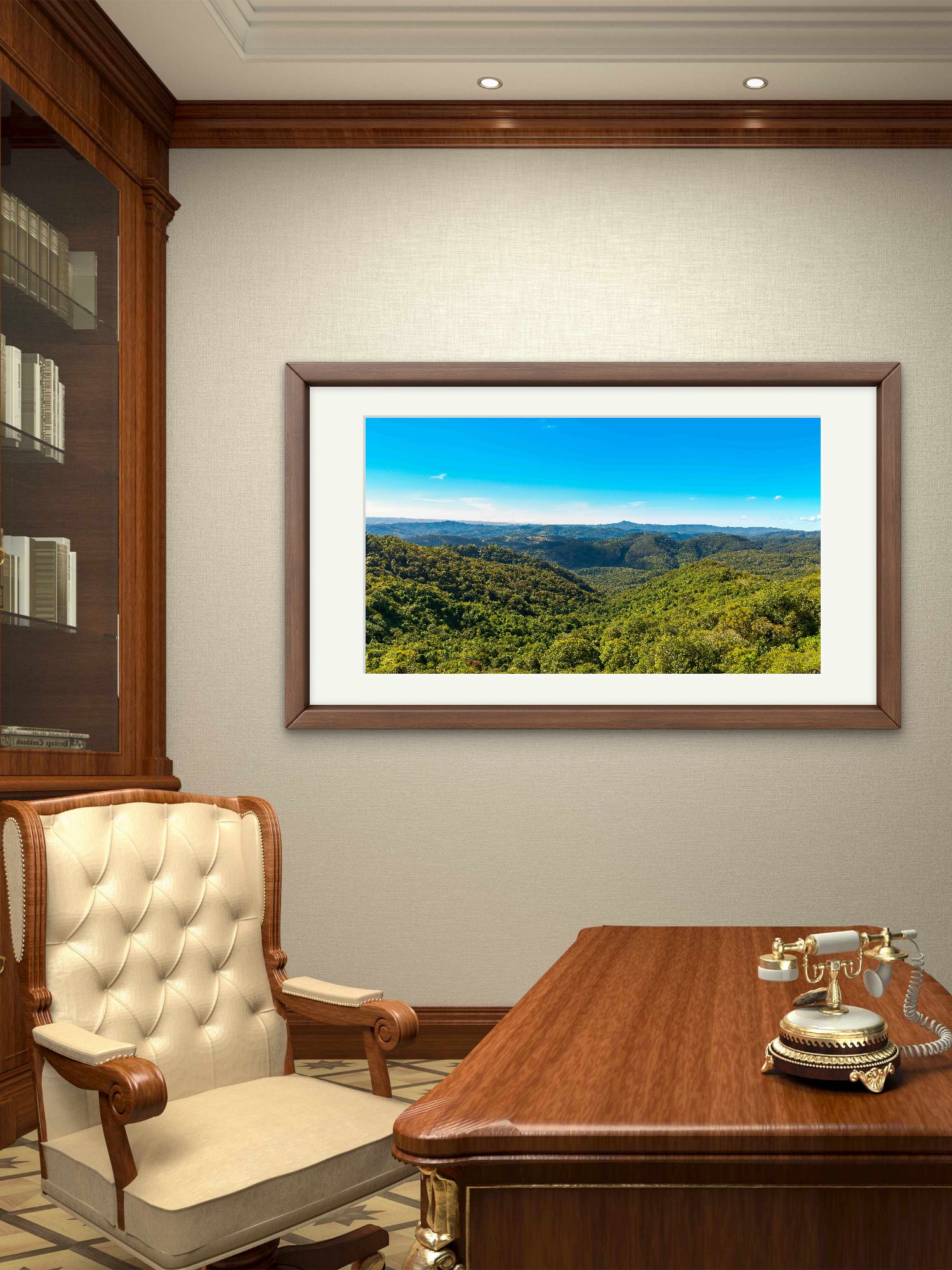 Impressa em papel Hahnemühle Canvas Art Smooth 370g, com acabamento que remete à textura da tela de pintura, a obra ganha profundidade e presença marcante. O tamanho generoso de 66 cm x 120 cm, sem moldura, valoriza a amplitude da paisagem e convida o olhar a se perder na imensidão da mata.