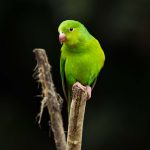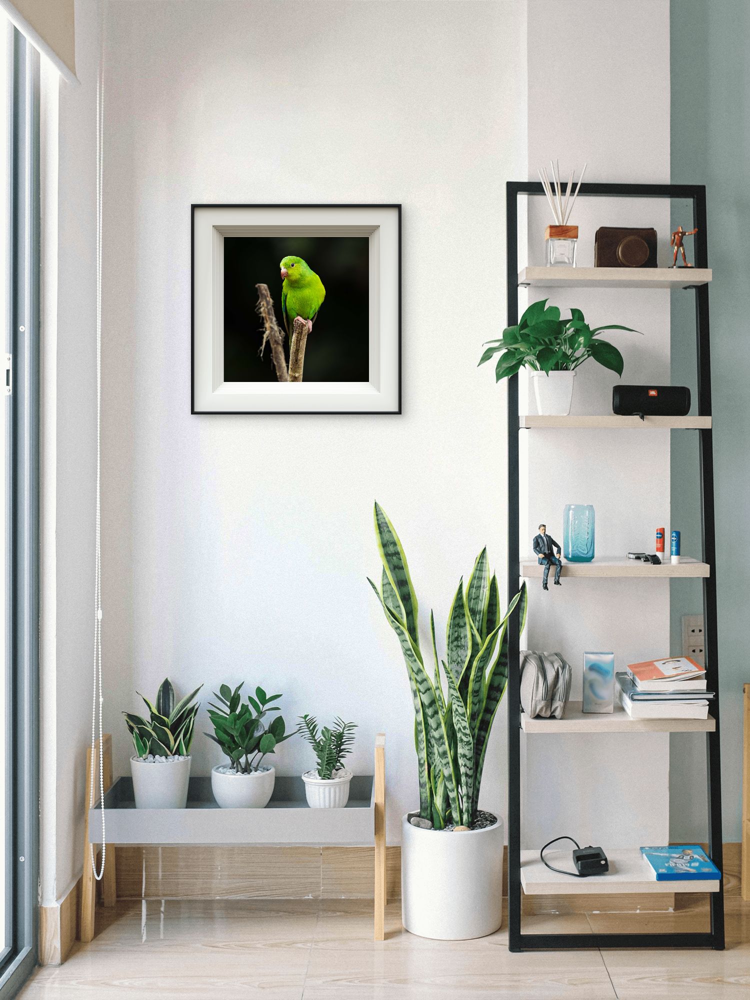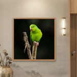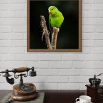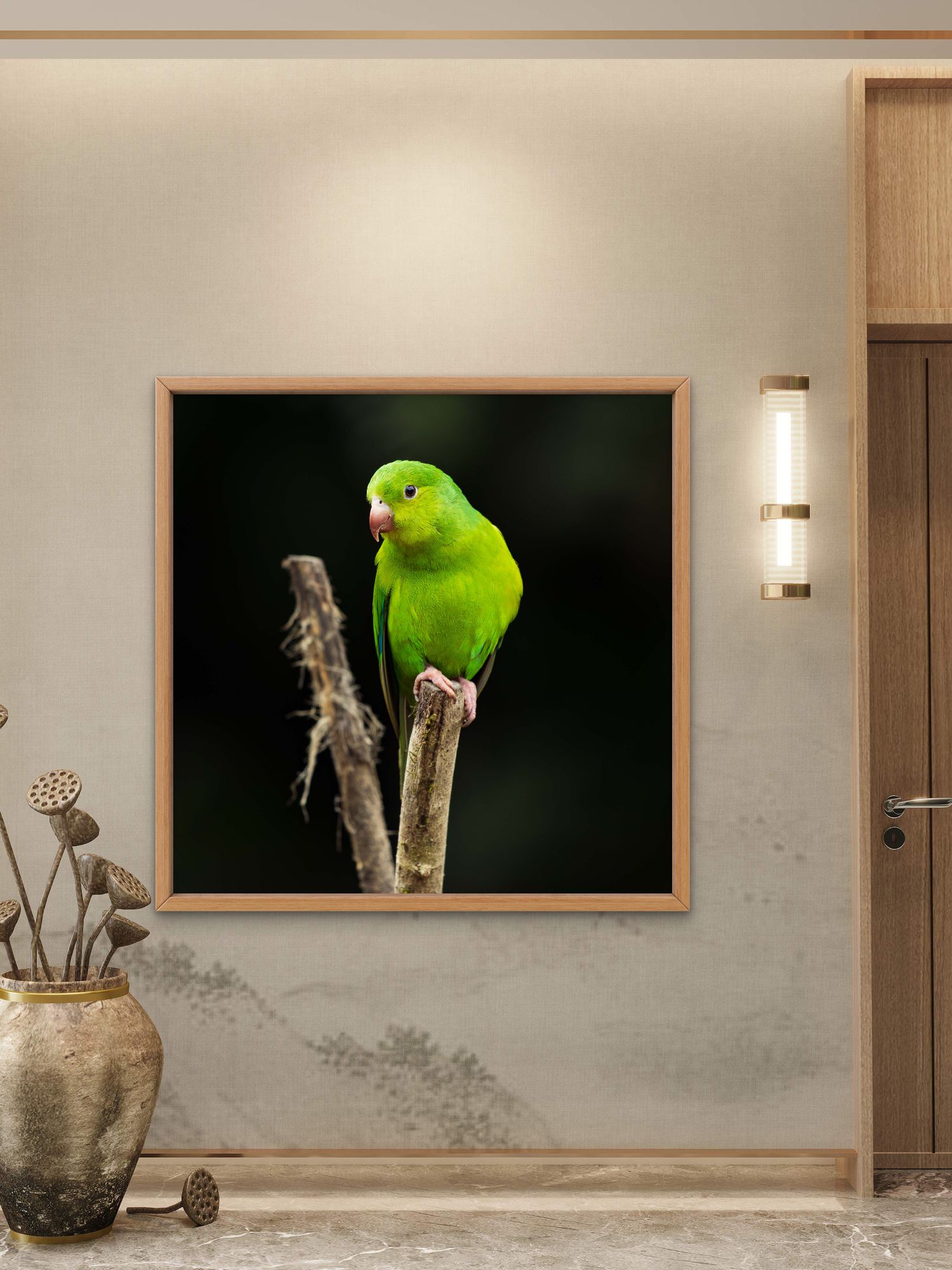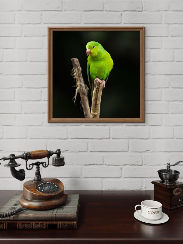 Composição minimalista e cromaticamente equilibrada, esta obra apresenta o Periquito-rico (Brotogeris tirica) — ave nativa da Mata Atlântica — em um raro momento de delicadeza e presença. Registrada no alto da Serra do Mar, a imagem se destaca pela pureza do verde vibrante sobre fundo escuro, criando um ponto focal de leveza e elegância para ambientes contemporâneos ou integrados à natureza.
