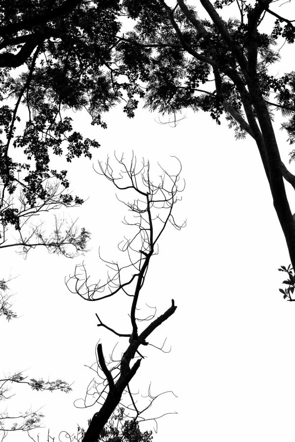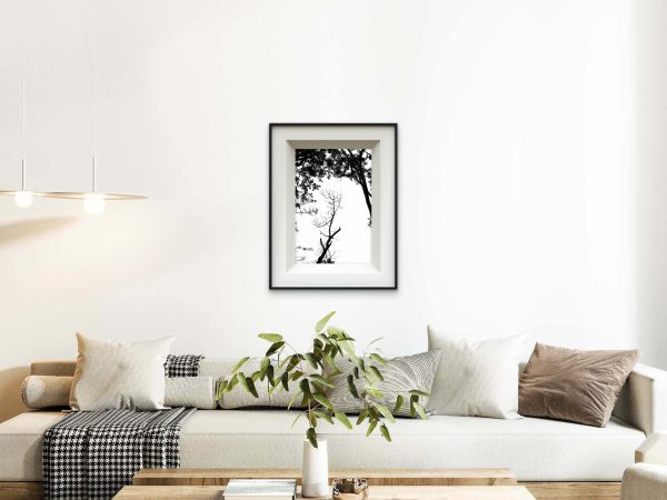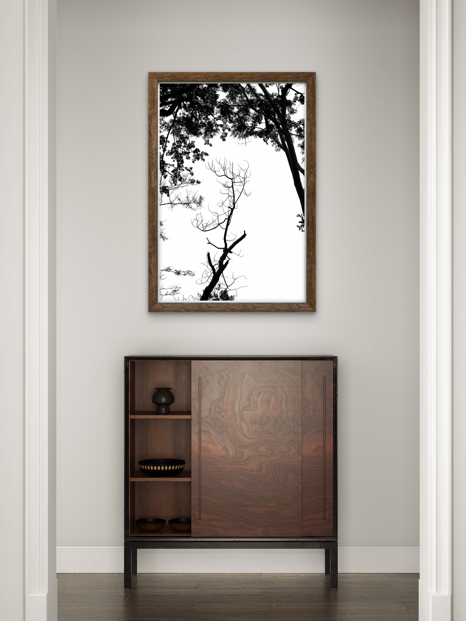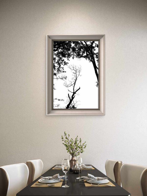 Fotografia fine art realizada no Pantanal sul-mato-grossense, parte da série “Verticalidades”, em que as estruturas naturais são observadas de baixo para cima, revelando formas gráficas e abstratas. Nesta imagem, galhos secos e copas densas se encontram em um contraste marcante, criando um desenho orgânico contra o céu claro. Uma composição minimalista que valoriza linhas, ritmo e silêncio visual.