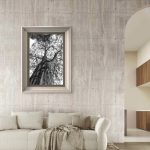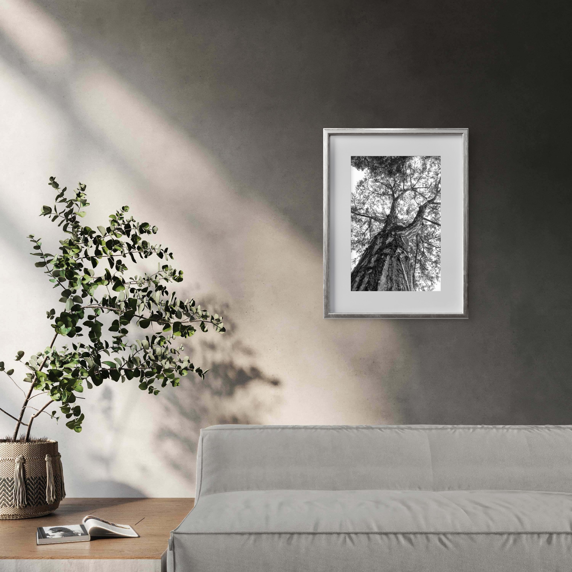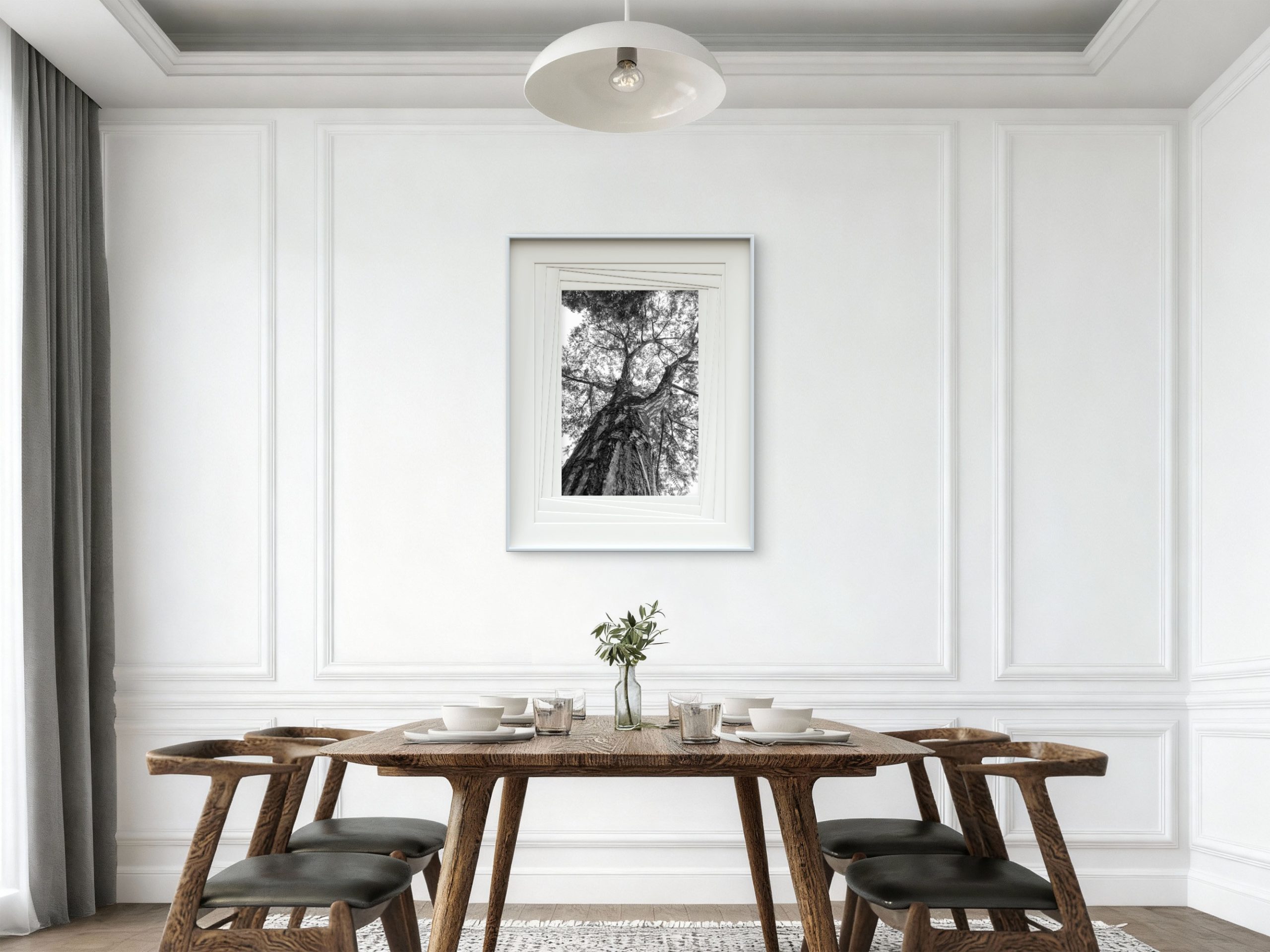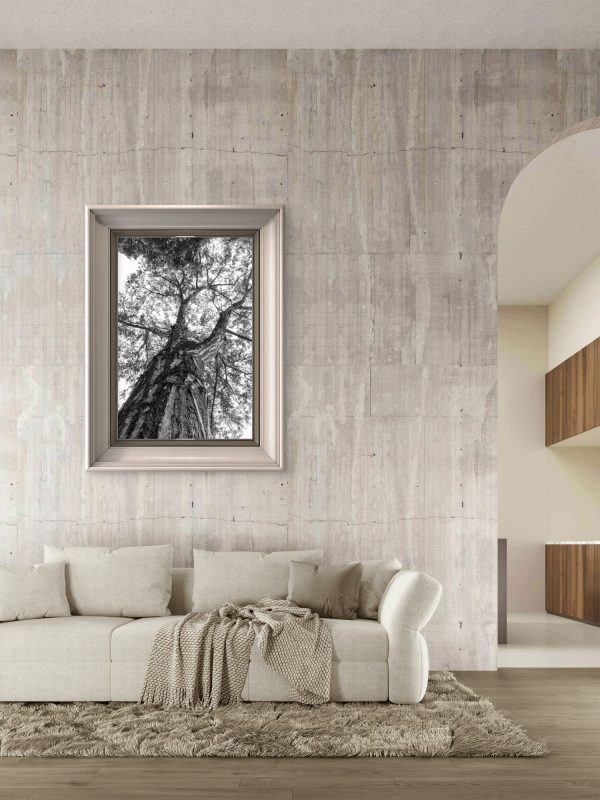 Fotografia da série “Verticalidades”, registrada no Cerrado sul-mato-grossense. O tronco texturizado conduz o olhar até a copa luminosa, destacando linhas, profundidade e a força gráfica da árvore. Impressa em fine art no papel Canson Photo Satin 240.