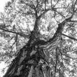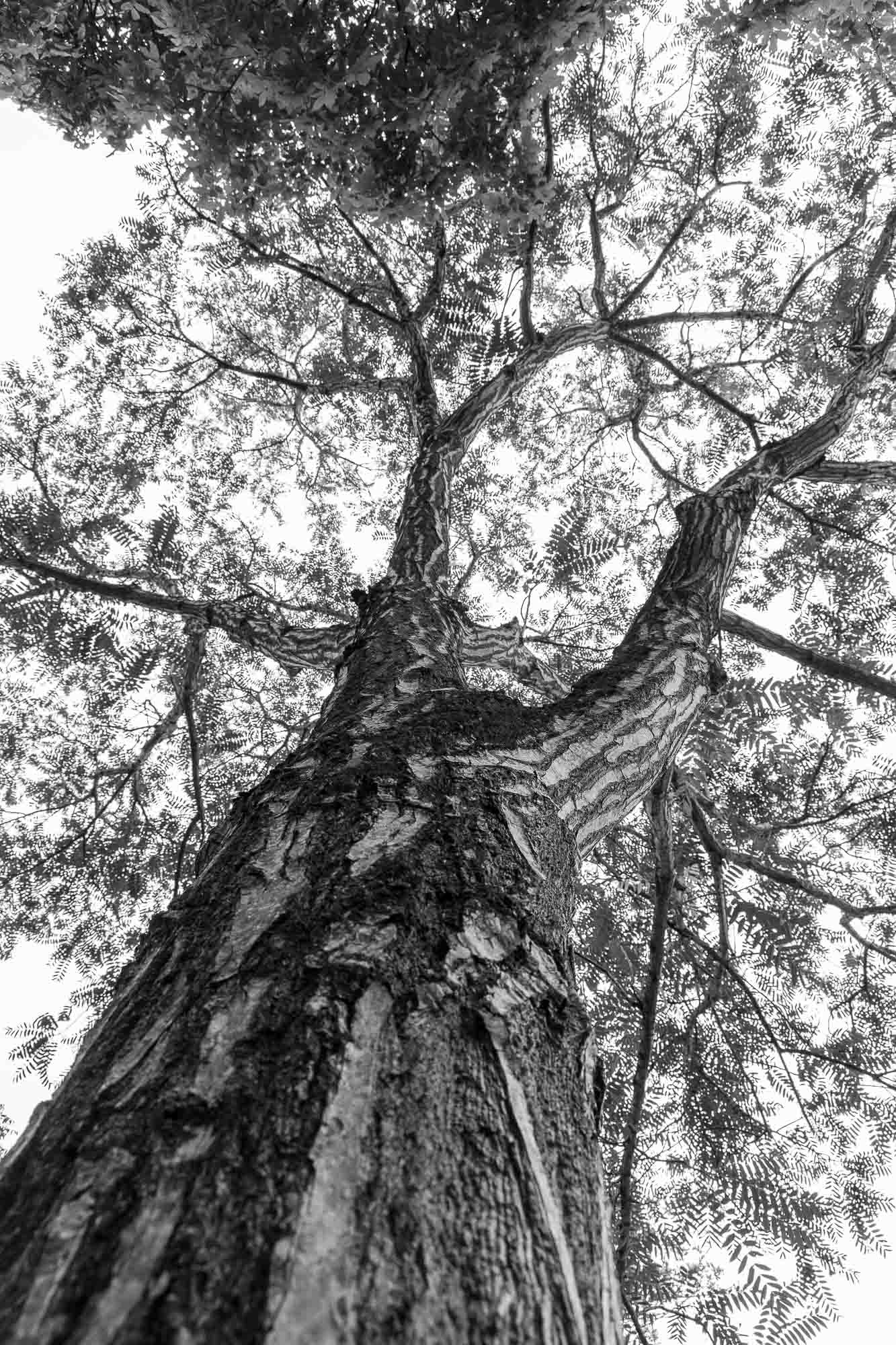 Fotografia da série “Verticalidades”, realizada no Cerrado sul-mato-grossense. Com um ponto de vista ascendente, o tronco texturizado conduz o olhar até a copa delicada, formando um desenho natural que combina força, ritmo e profundidade. Uma composição em preto e branco que valoriza contrastes e revela a arquitetura orgânica da árvore.